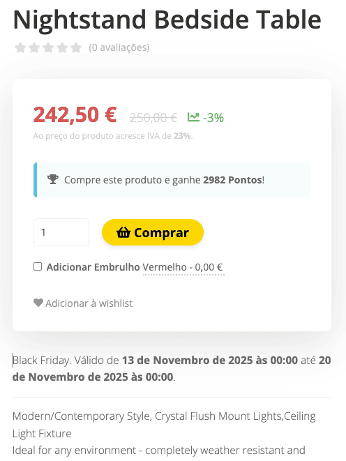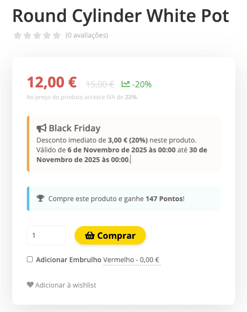 - Caixa de aviso: Cria um destaque visual num bloco dedicado do detalhe do produto, com o nome da campanha, valor do desconto e data de validade. Este destaque surge visível abaixo do preço do produto.